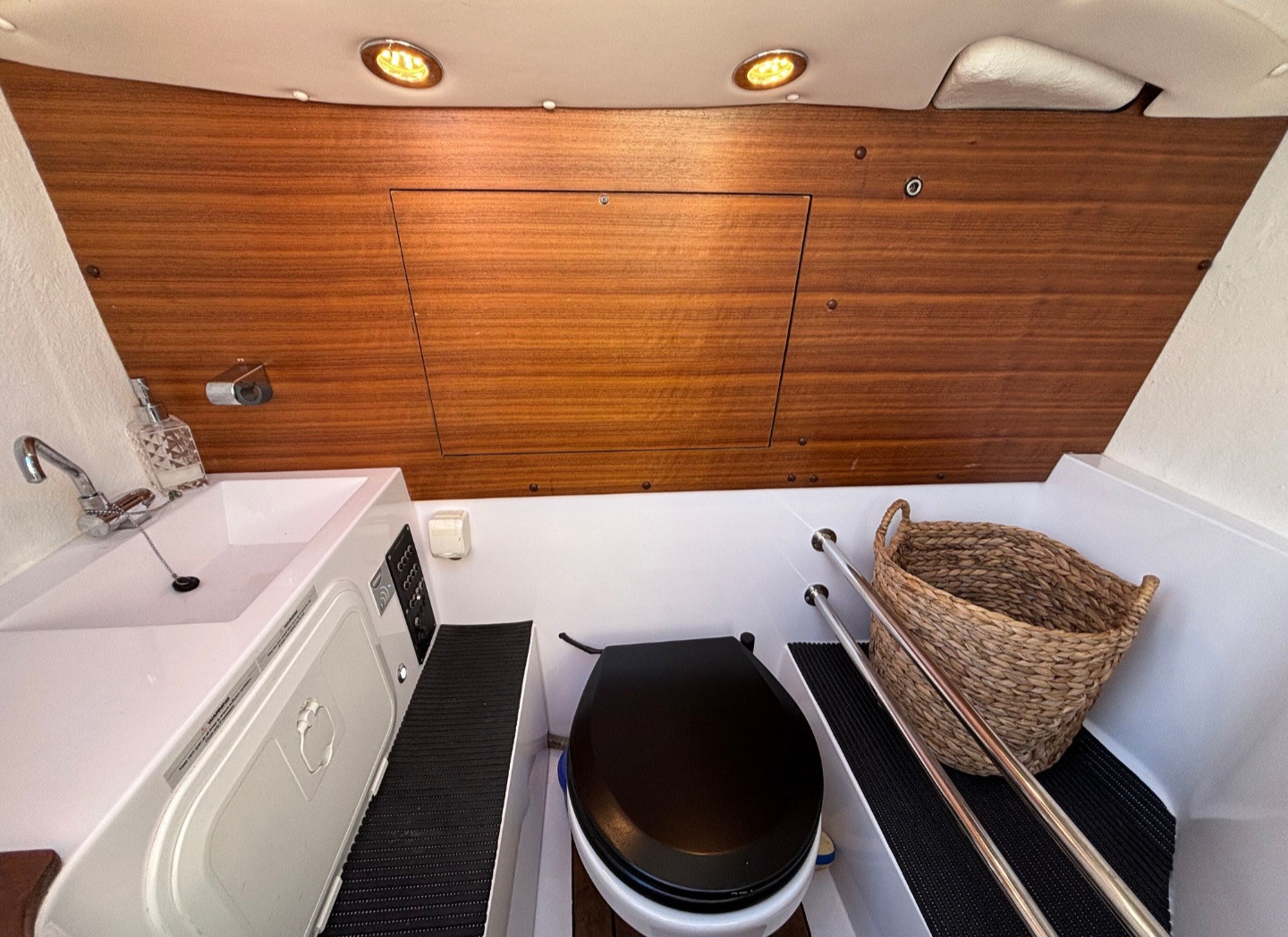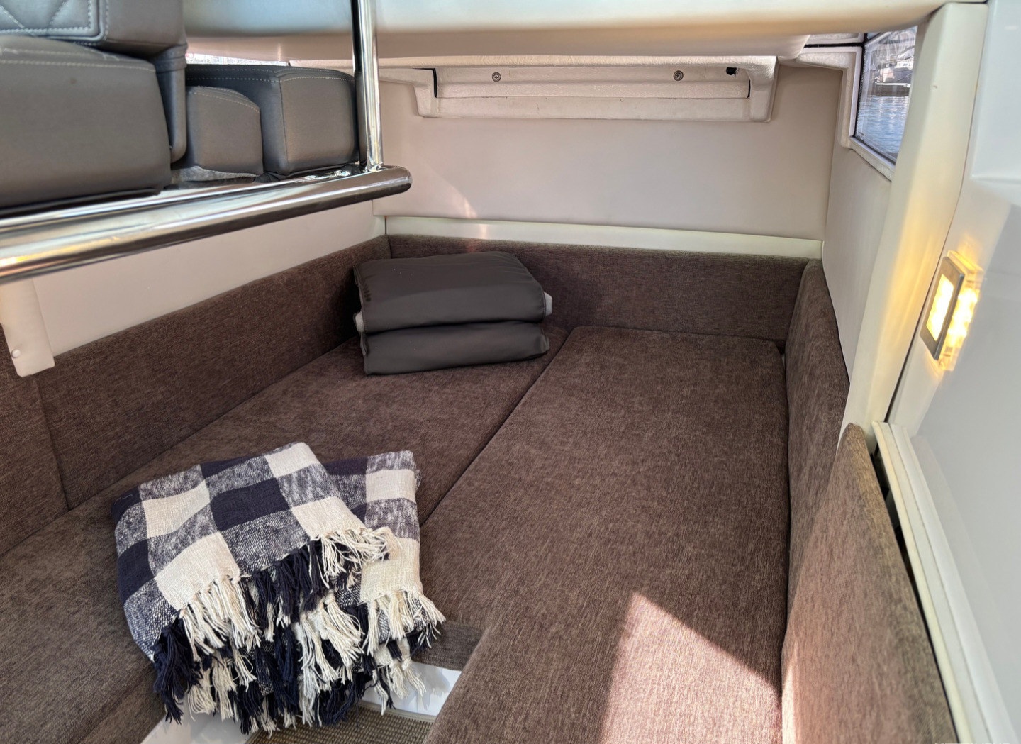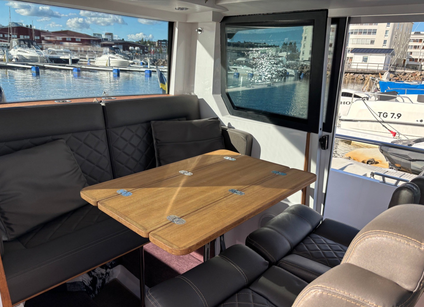 I fören finns plats för 5 passagerare att sitta och njuta av fartvinden i soffan som också enkelt göras om till en solbädd. Större solbädd går att hitta ovanpå akterkabinen där det finns goda möjligheter att slappna av och njuta under solen. Sitter man hellre inomhus går detta lika bra då båten tillhandahåller en tresitsig justerbar soffa som antingen fälls upp för att komma åt dubbelkojen, eller ner för en bekväm plats att sitta under färd. Soffan kan även göras om till en dubbelkoj, vilket ger plats åt 4 personer att övernatta på båten. Även förarstol och passagerarstol kan fällas upp och ger på så vis tillgång till det enkla men tillräckliga pentryt. Stolarna går även att vända på för att skapa en matsal där hela sällskapet sitter bekvämt runt matbordet. Båtens toalett med elektrisk WC är placerad en trappa ner på fördäck.
