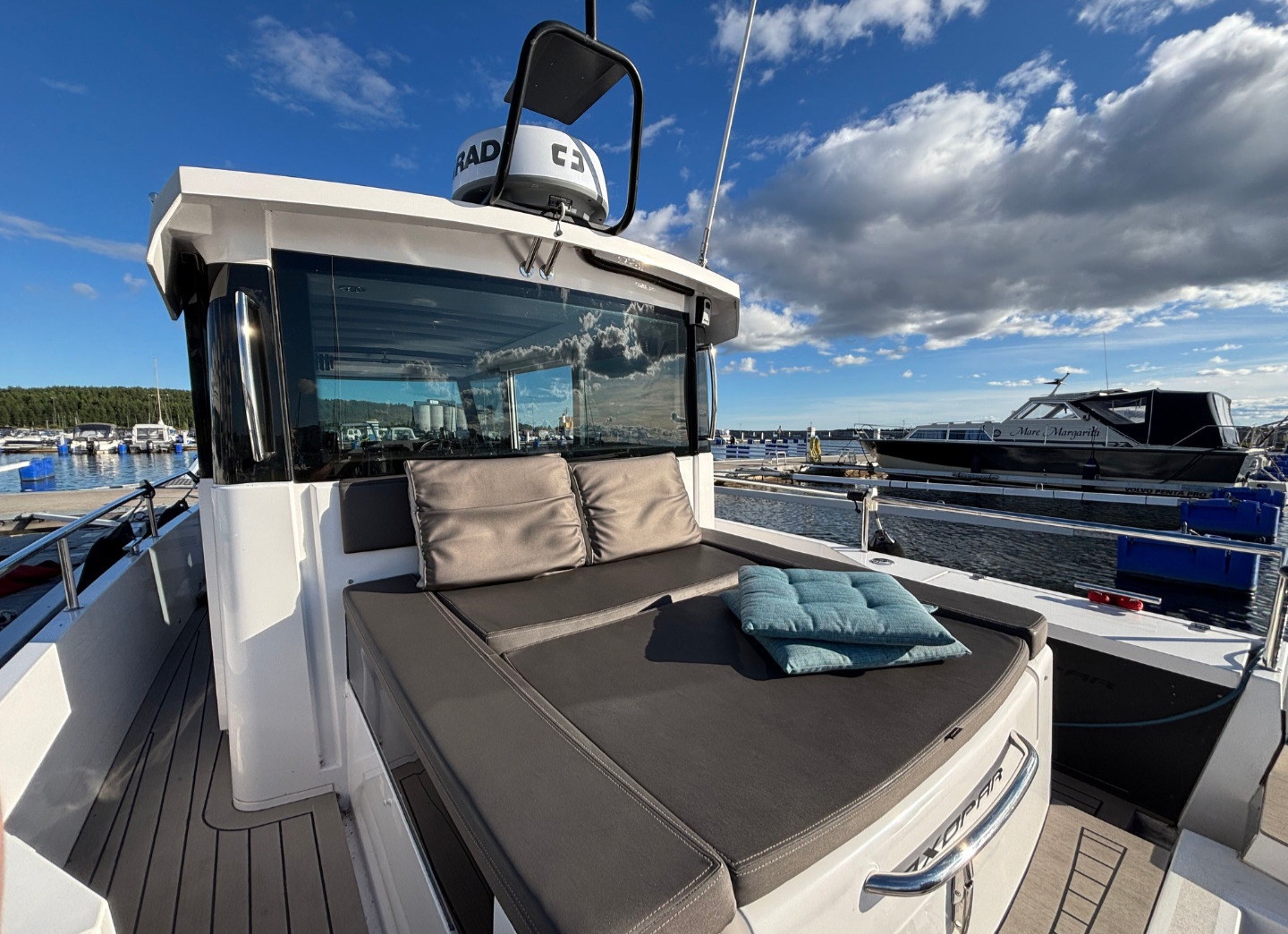 Utformningen av denna 28-fotare skiljer sig från majoriteten av dagens kabinbåtar i samma storlek. Här har smarta lösningar möjliggjort sovplatser för den medelstora familjen, men i fokus ligger de stora ytorna på däck och fantastiska sjöegenskaper.